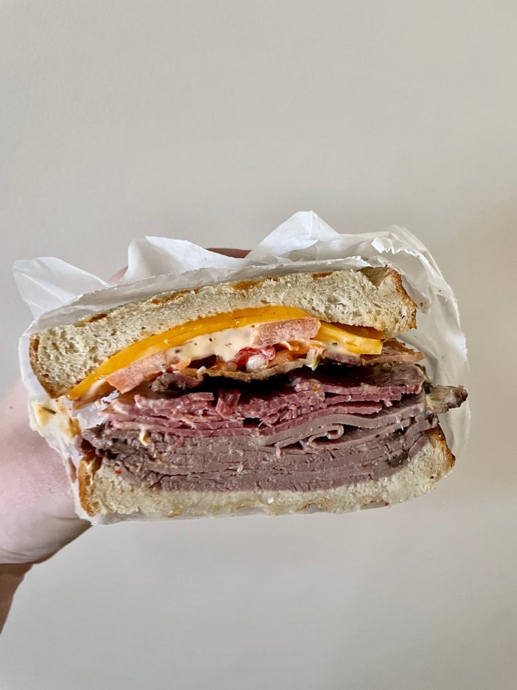 Roast beef, roasted turkey, Muenster cheese, red onion and chipotle mayo.